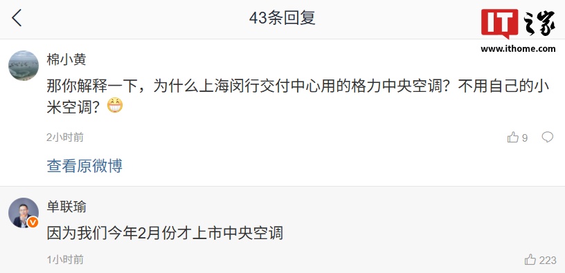 单联瑜还在褒贬区恢复了为什么上海闵行请托中心用的格力中央空调,而不是小米空调这一问题:“因为咱们本年 2 月份才上市中央空调”。
