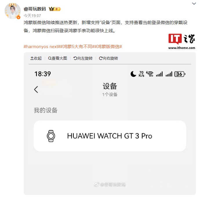博主 @睿哥玩数码 爆料称,鸿蒙微信扫码登录鸿蒙腕表功能很快上线。