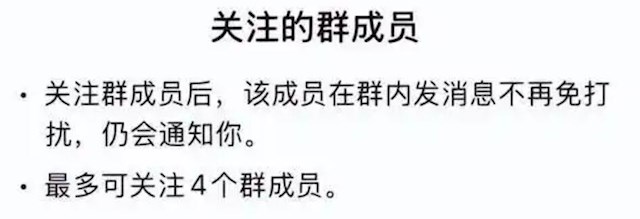 群聊音讯免惊扰优化:选藏某个群成员后,该成员在群内发音讯时不再是免惊扰气象,仍会见知你,你最多不错选藏4个群成员。